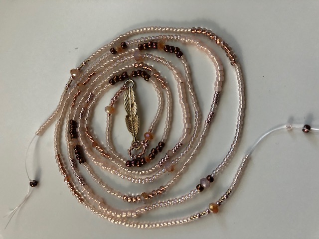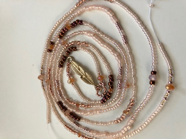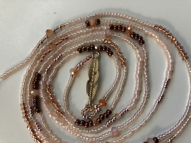 Accent your waist in this beautiful peaches, pinks and gold waist bead charmed with a beautiful gold colored leaf charm