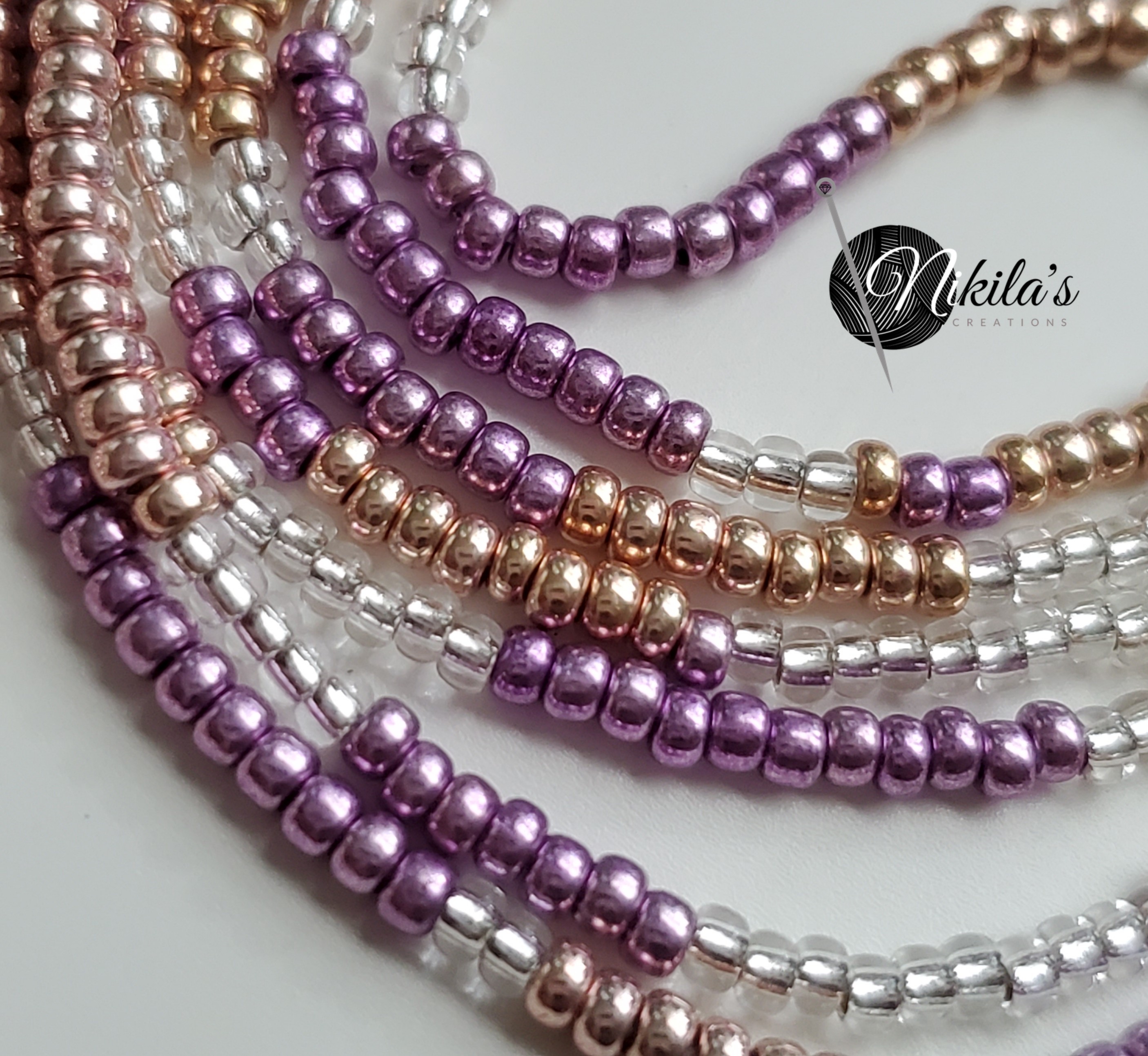 Lavender, sliver lined clear, metallic pink and gold 11/0 seed beads. A simple yet bold statement in a sweet way. *Tie-on style *40-45 inches in length