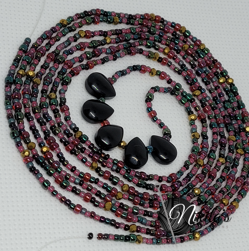 A mix of burgundy, greens and gold seed beads and rondells accented with black. This randomly threaded waist bead has beautiful completely black drop beads that adds a bit of interest to the waist.