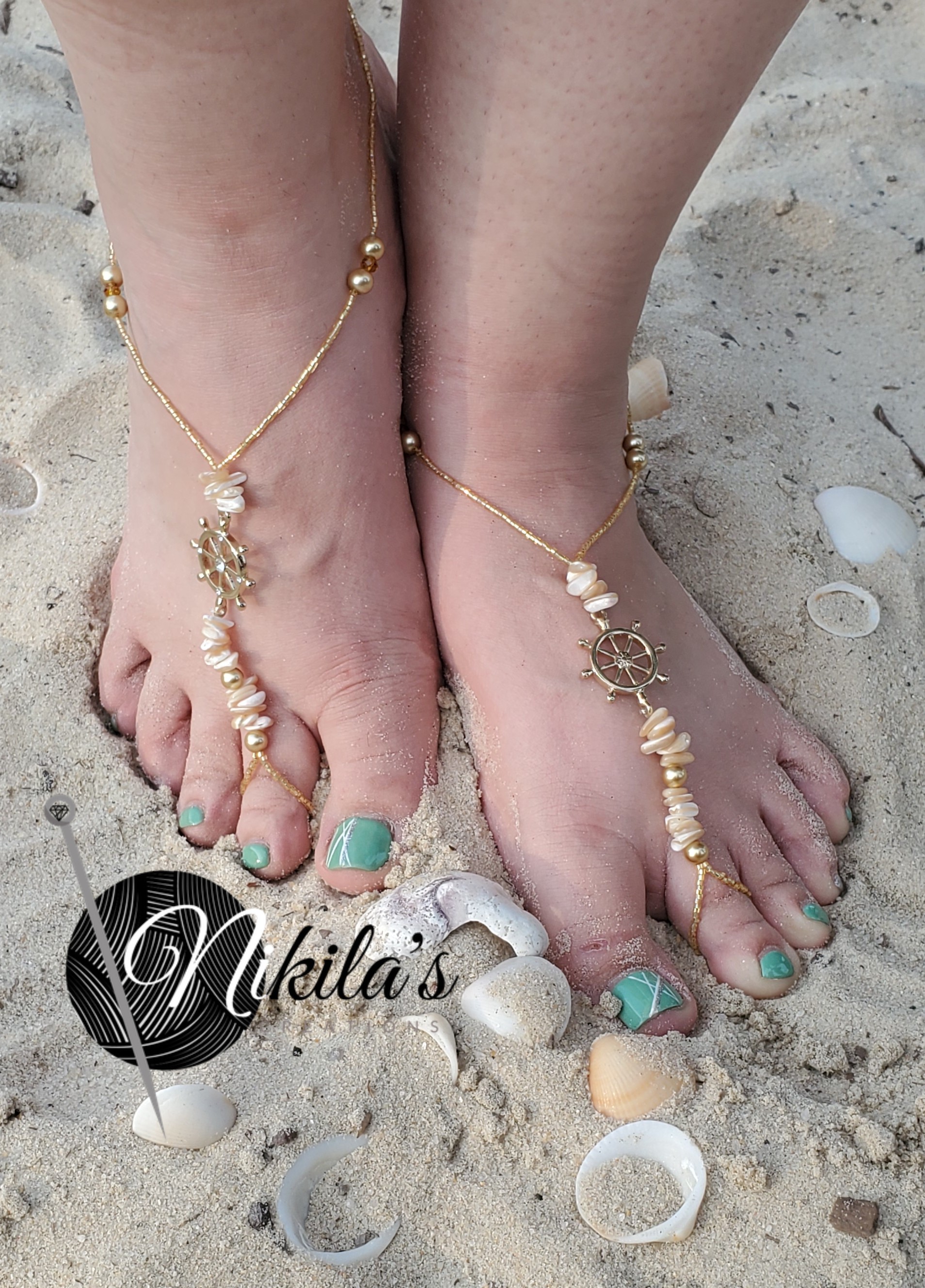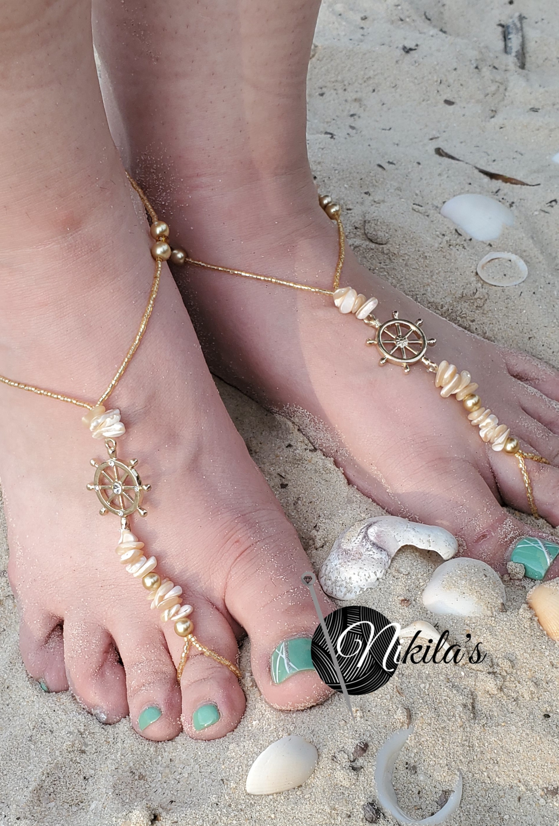 Are your feet ready for a vacation? From the beach to the pool walk around in fashion with these beautiful barefoot sandals. Moon stone chip beads wrap around the ship's gold wheel. Glass pearls and tiny gold seed beads complete the look