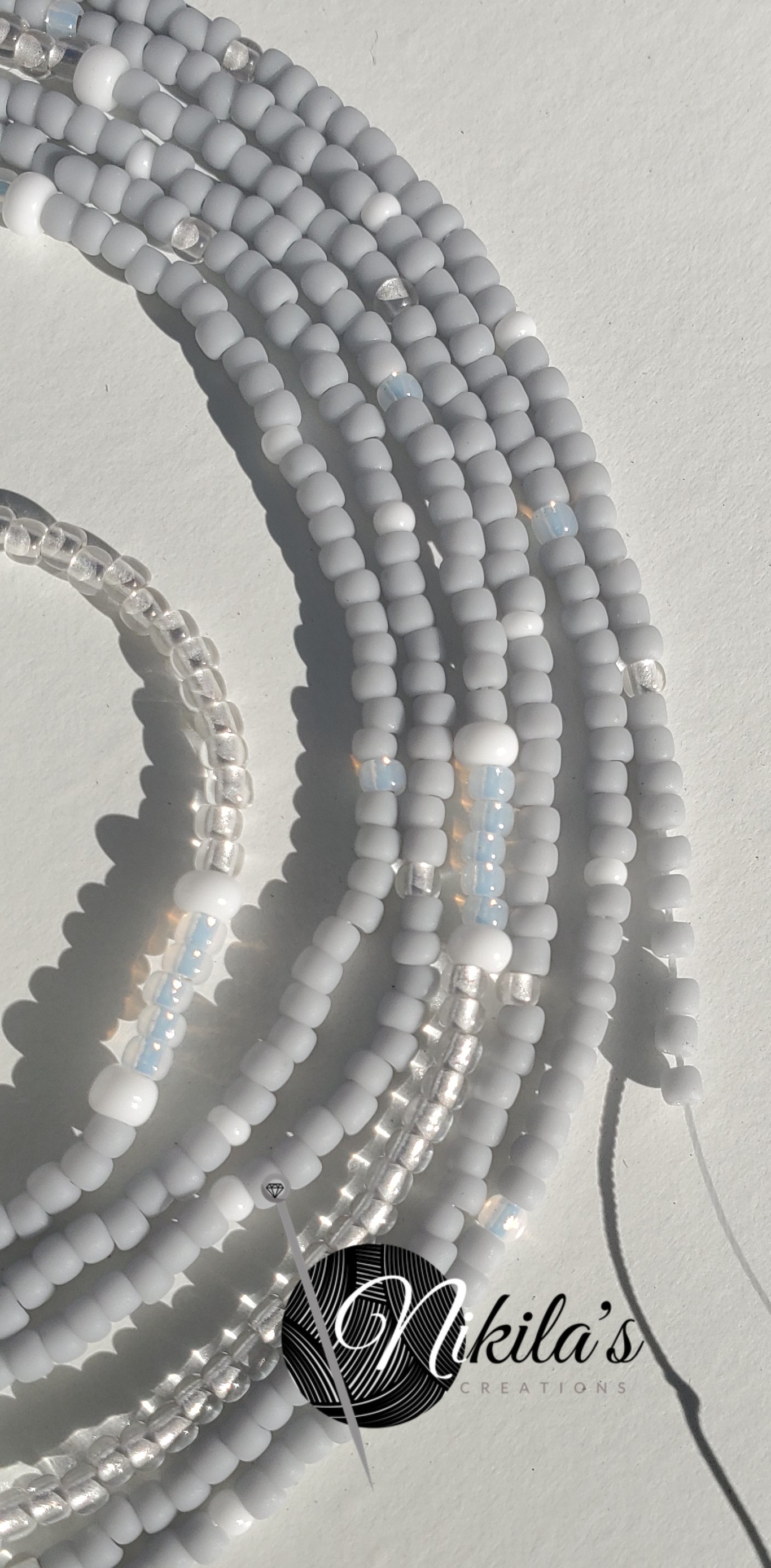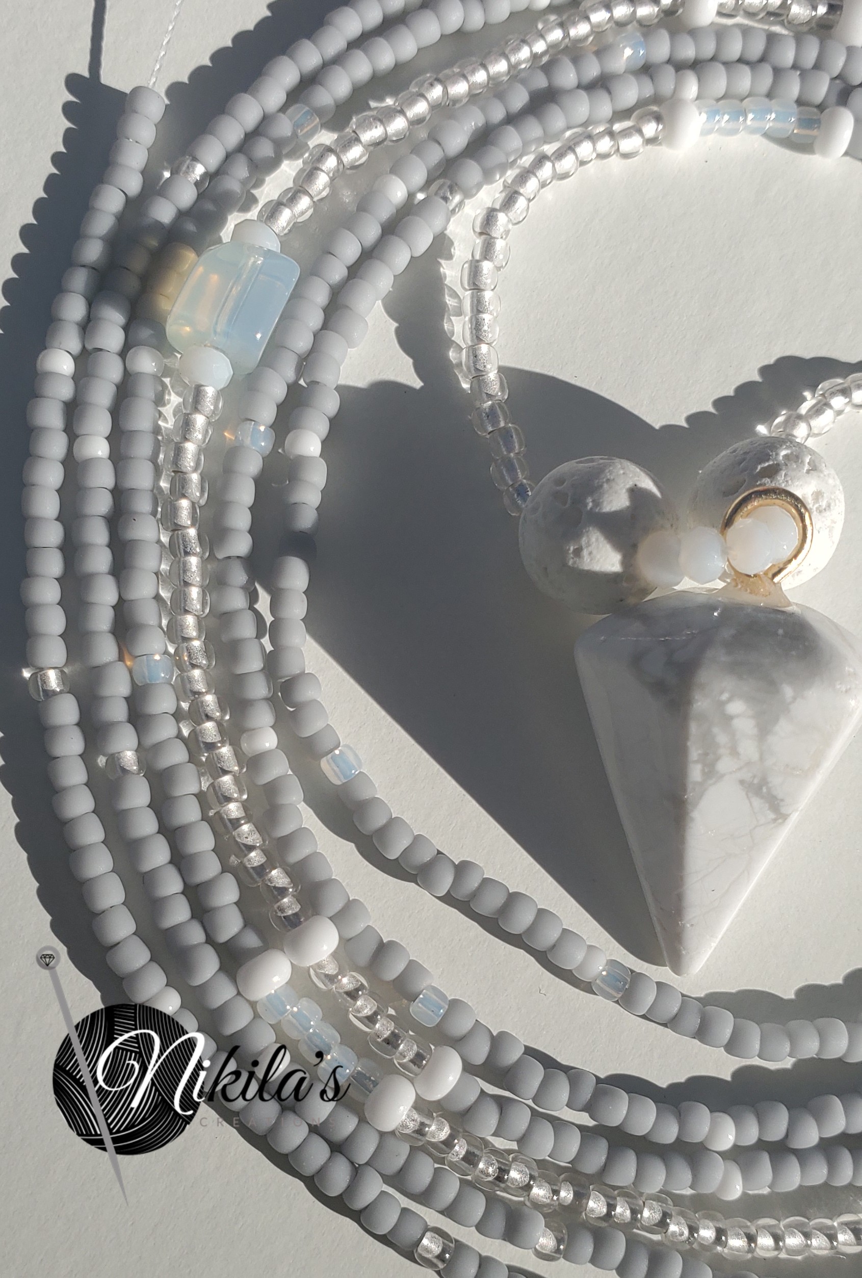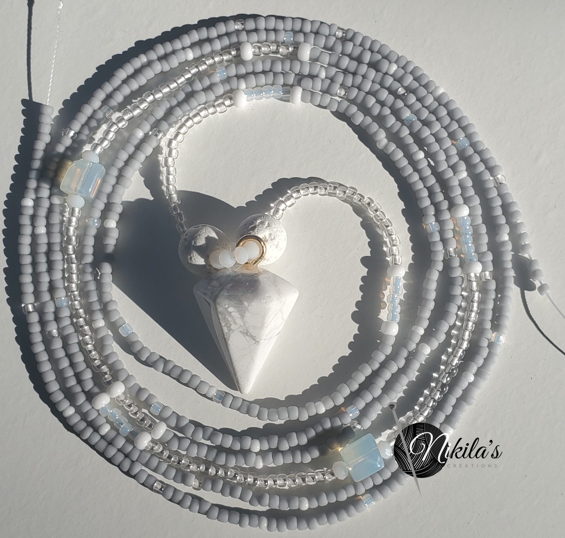 Soft smoky gray seed beads accent a Howlite pendulum focal. Fits up to a 50 inch waist Handmade one of a kind, will not be duplicated.